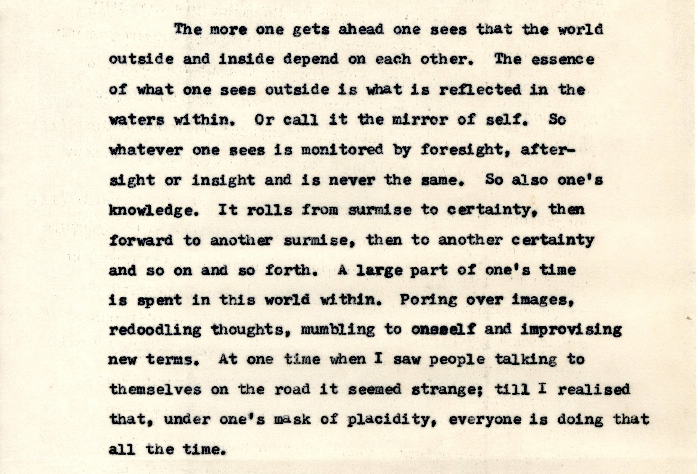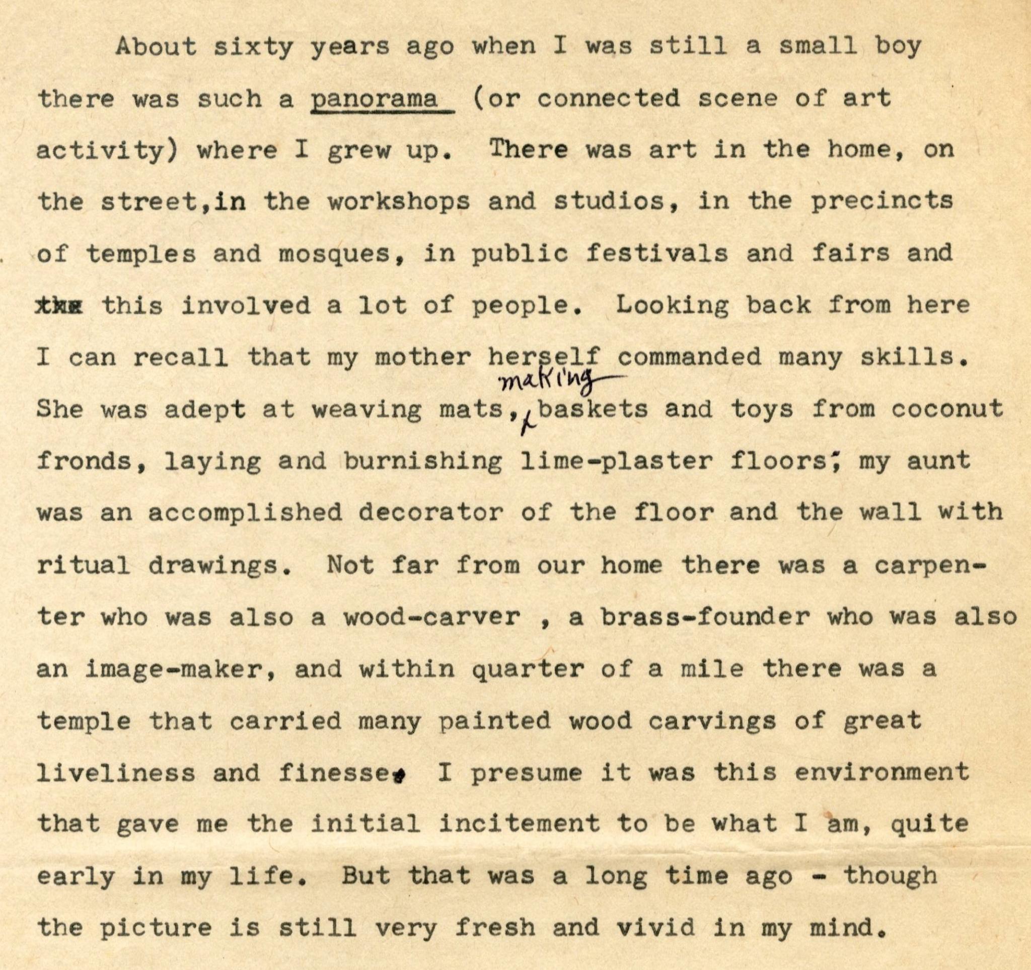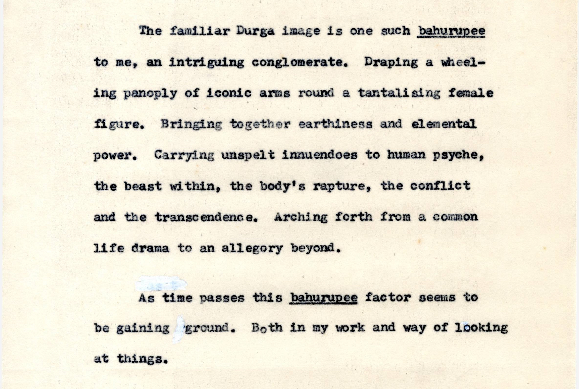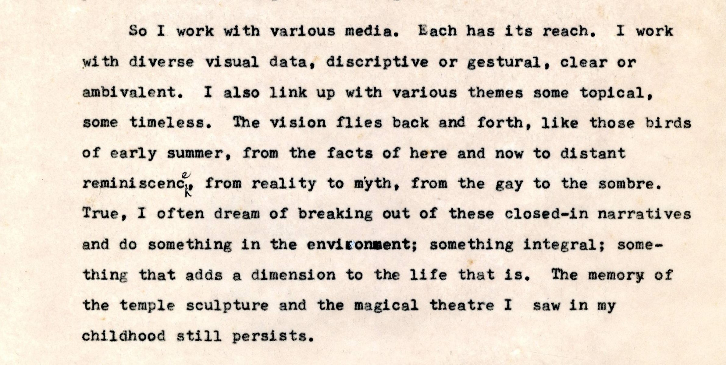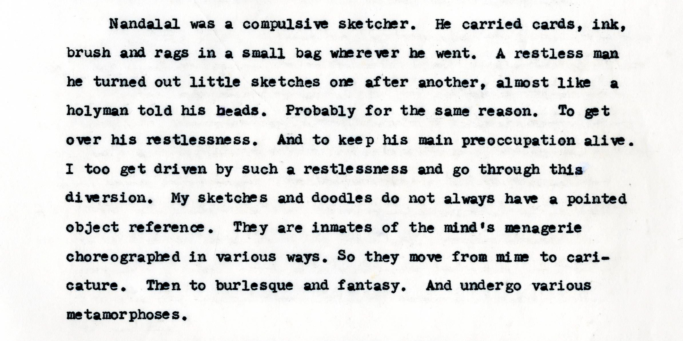 AH: To begin with, I'll go with what is most evident: My question to both of you is that we do know that K.G. Subramanyan as a figure is extremely important within the subcontinent and a lot of work has already been done on Subramanyan, in terms of his writings, his practice and his pedagogy. What were your impulses to work with Subramanyan’s artworks and his archive, and how do you see this collaboration between two institutions would add to the already existing discourse on Subramanyan? SB: The starting point for the exhibition was a rather straightforward pairing of what was shared in MAP’s collections and AAA’s archives. The shared interest in Subramanyan arose because MAP had a number of his works across mediums and materials, including painting, terracotta etc. but what AAA’s collections had was over 130 digitised manuscripts of his writings on art published in magazines, journals, and the like. So, the initial impetus for this was to really jump into his writing and take that and the ideas therein as starting points to approach his work. Both Vaishnavi and I, sitting in Bangalore and Delhi, without any sort of direct connections to the artist or the Faculty of Fine Arts, M.S.U Baroda, took deep dives into his writings (from 1960 to as recently as 2012) which are easily accessible as PDFs. It was quite a wide range that we were simply reading. Of course, we are familiar with his work more through large scale retrospectives and monographs, or his monumental murals in public space - all of which are great to experience! However, we wanted to approach Subramanyan less through the lineage of a master artist and more in terms of his thoughts on pedagogy and especially teaching, as that was such a major part of his life. We also wanted to learn how he spoke of his practice, his reflections over the years, his “visions”.